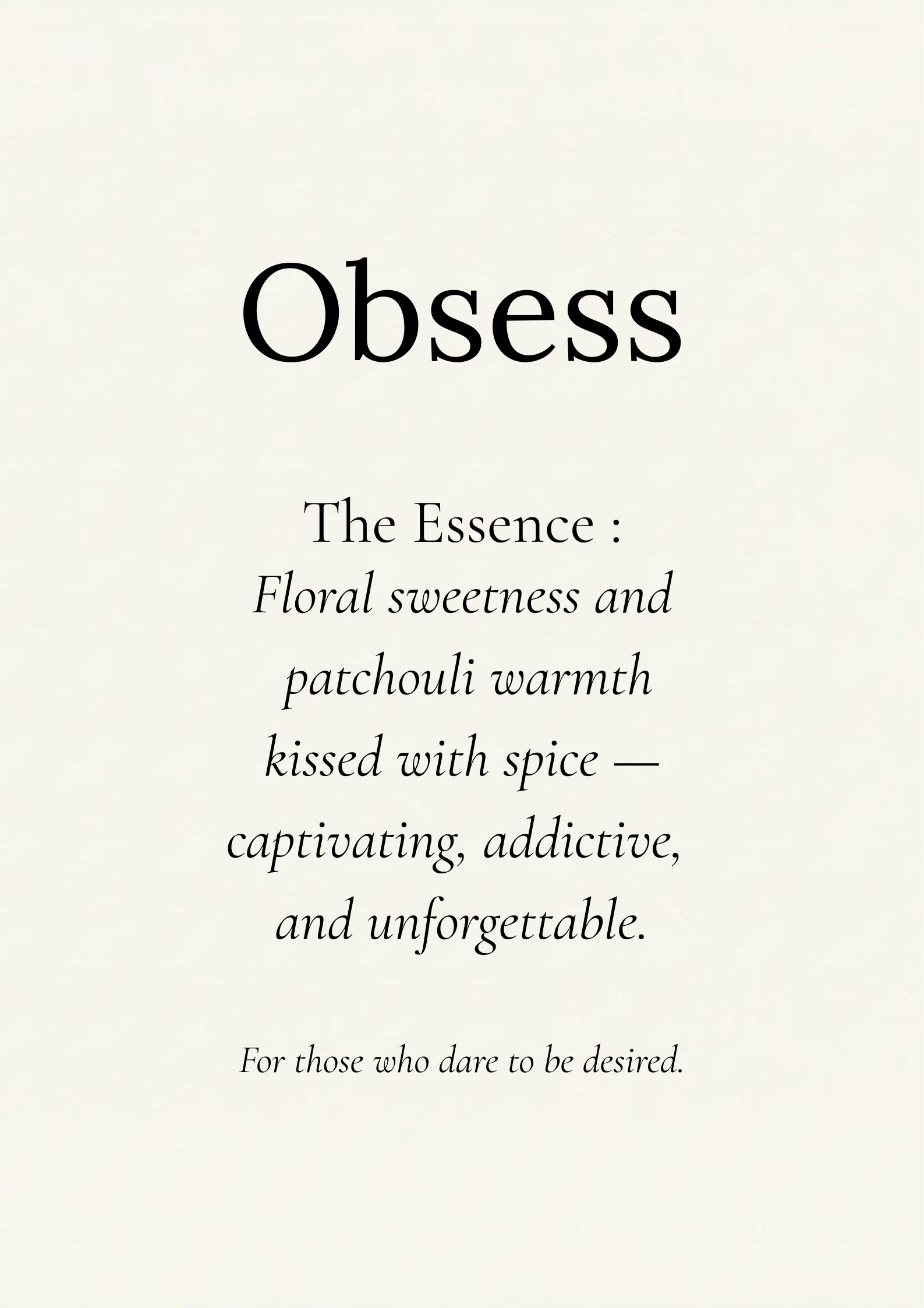 Intense and addictive, OBSESS blends bold spices and deep woods to create a fragrance that lingers long after you've left the room. Designed for those who dare to stand out, it reflects the art of modern seduction.